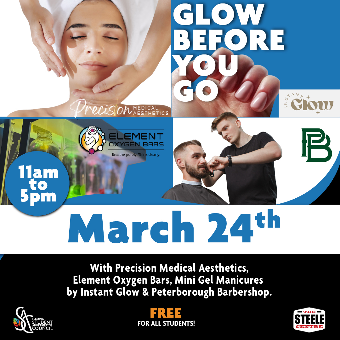 • Stop by the Steele Centre Pub for a quick refresh before your grad photos and interviews.Enjoy free facials, mini manicures, fresh haircuts, and an oxygen bar to help you relax and get camera-ready!