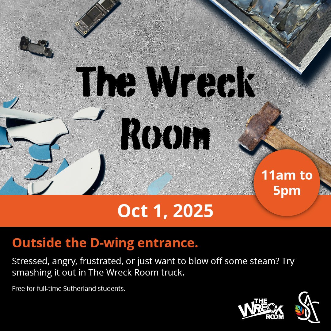 Release your stress in a safe, fun way! The Wreck Room brings a mobile smash room to campus on Oct 1 from 11am–5pm. Grab a bat or throw something at the walls, a perfect way to let off steam during Mental Illness Awareness Week. Free for all full-time Sutherland students.