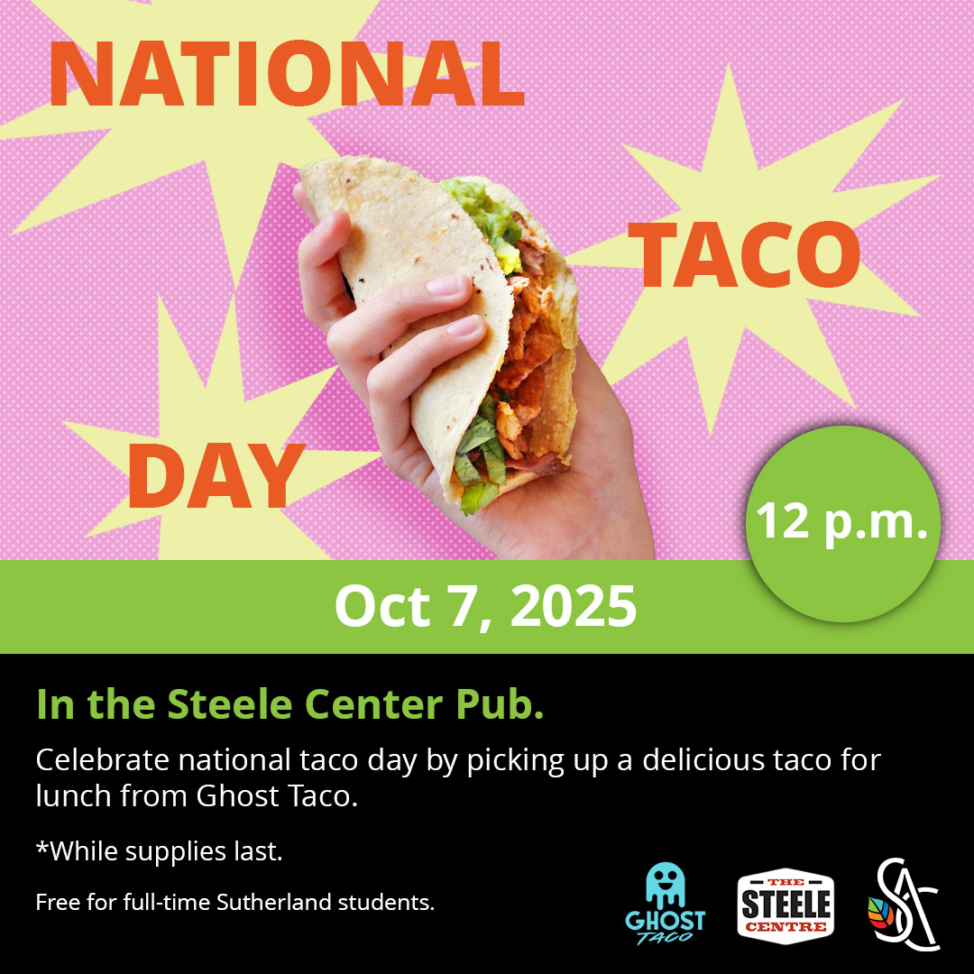 Celebrate National Taco Day with a delicious taco lunch at the Steele Centre Pub on October 7 at 12pm! Come grab a bite, hang out with friends, and enjoy everyone's favourite handheld feast.